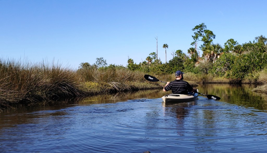 Today David surprised me with an invitation to kayak. I immediately said yes, gathered my hat and my phone (for photos), and went to the creek on this beautiful sunny Florida day. He was already in and waiting, so I dragged my kayak to the shore and stepped in. I realized too late that this method, while it works well for him, does not work for me.