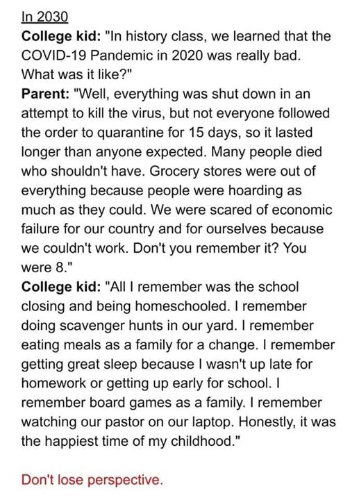 While I can’t say this is the avenue I would have chosen, some of the consequences of this vile thing are not necessarily bad. Interestingly enough, the ozone is healing, there is little or no smog in the formerly polluted air around the world. Families are spending unprecedented time together, people are working from home and kids are learning online.