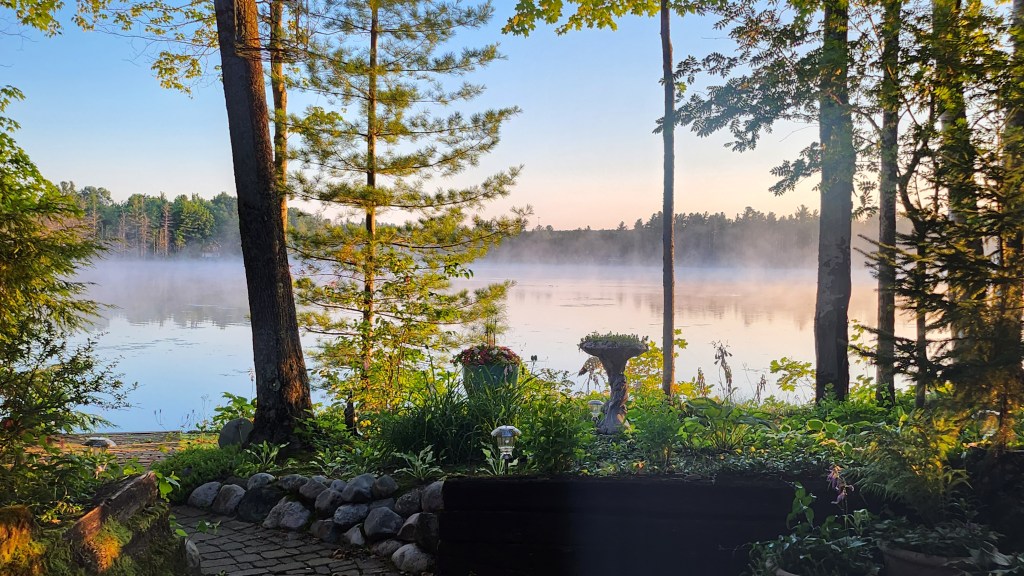 Many mornings I would wake just as dawn was breaking and look through the doors to see mist rising from the water obscuring the reflection of the trees across the lake. I would hear the loons already fishing, their calls blending with the sandhill cranes. Wild Kingdom had nothing on this place! If it was warm enough or I was bundled enough I would take my coffee and sit on the glider outside my door and soak up the sunrise, the view, and the peace.