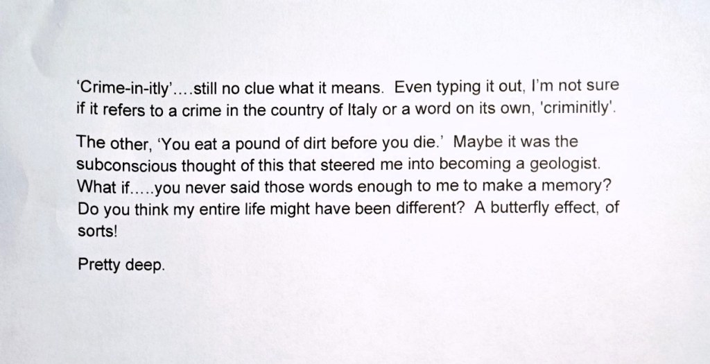 So sweet. I never knew that Andrew wrote this to Mom. It’s refreshing to remember ‘Crime-in-itly’ and ‘You eat a pound of dirt before you die’. I had forgotten these, so thanks to Andrew. CO